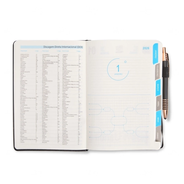 A Agenda 2026 reúne elegância e praticidade para o uso executivo. A capa dura em PU confere acabamento premium, enquanto o elástico de fechamento, o marcador de páginas em cetim e o porta‑canetas otimizam o uso no dia a dia. O miolo inclui seções essenciais para a rotina corporativa: dados pessoais, calendários 2026 a 2028, lista de contatos e tabelas de pesos e medidas. Formato próximo ao A5 (21 x 14,3 x 2,5 cm), perfeito para pastas, mochilas e kits de boas‑vindas. Personalize com a logo da sua empresa para brindes corporativos, eventos e campanhas.