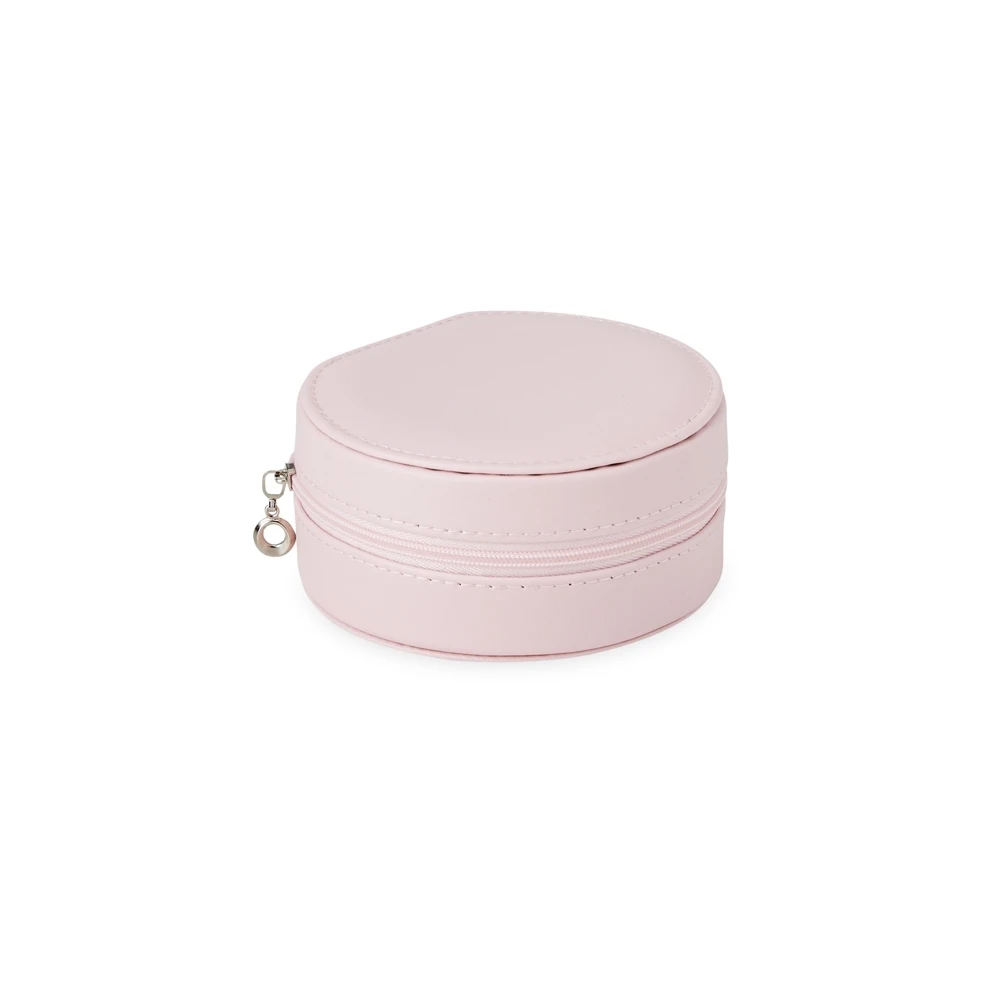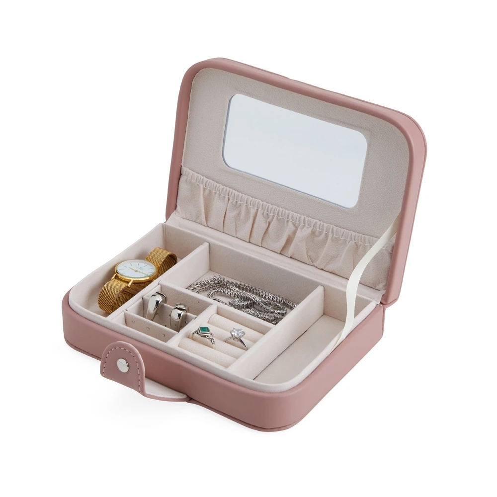 - A segunda opção reúne bolso elástico, três ganchos na tampa, divisória multiuso e base almofadada com ranhuras para anéis — praticidade compacta para uso em nécessaire ou gaveta.
