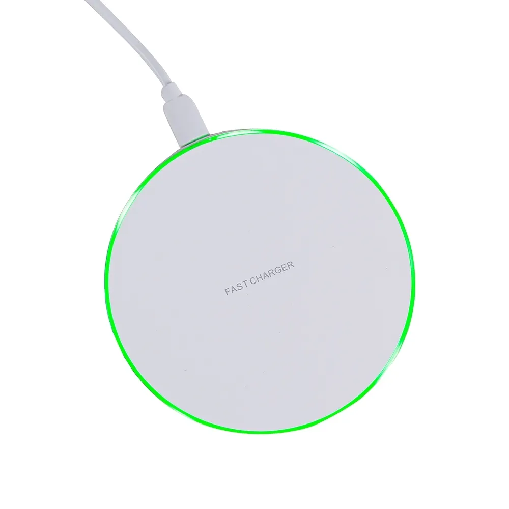 Já a base de carregamento em formato de disco, em plástico com antiderrapantes de silicone, opera por indução Qi: basta conectar a uma fonte USB e apoiar o aparelho. Possui luzes indicadoras e suporte a carga rápida quando o telefone permite; caso contrário, realiza carga padrão.
