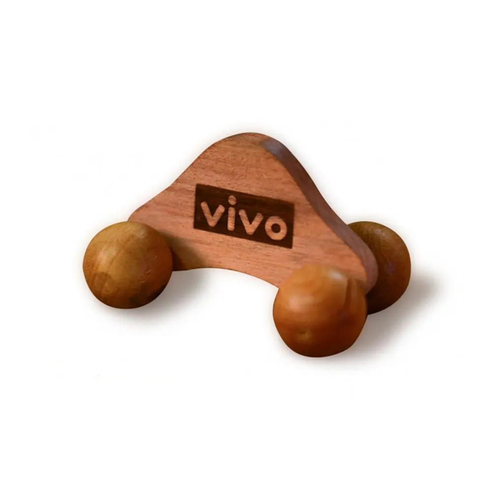 Já o massageador manual, produzido artesanalmente em madeira reaproveitada, é compacto e conta com três esferas de 25 mm que proporcionam estímulo firme e uniforme em todo o corpo. O design ergonômico facilita o controle de pressão, dispensa bateria e funciona bem em ambientes silenciosos, reforçando valores de sustentabilidade.