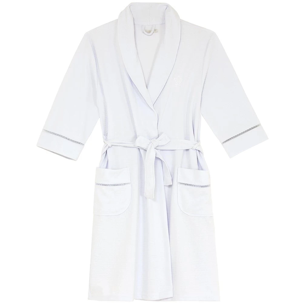 Já o roupão em piquet, em mistura de algodão e poliéster, traz toque macio, caimento leve e funcionalidade: bolsos frontais, mangas ¾ e cinto para ajuste prático, perfeito para circulação na clínica ou homecare.