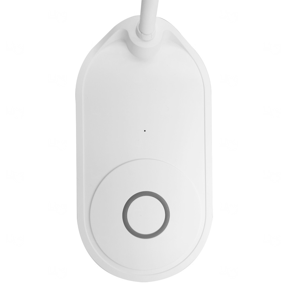 Lâmpada LED com carregador por indução, fabricada em plástico, com haste flexível emborrachada. Possui anel de borracha para proteger o aparelho contra arranhões e quatro pontos emborrachados para evitar deslizamentos. Oferece três opções de luz: amarelo forte, branco forte e amarelo fraco. Ideal para eventos corporativos, campanhas promocionais e brindes personalizados.