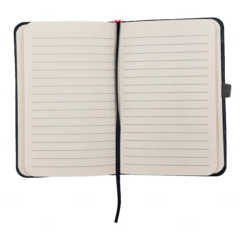 Kit Caderneta 9x14 cm c/ elastico para segurar a caneta, 1 caneta numa sacolinha de veludo.