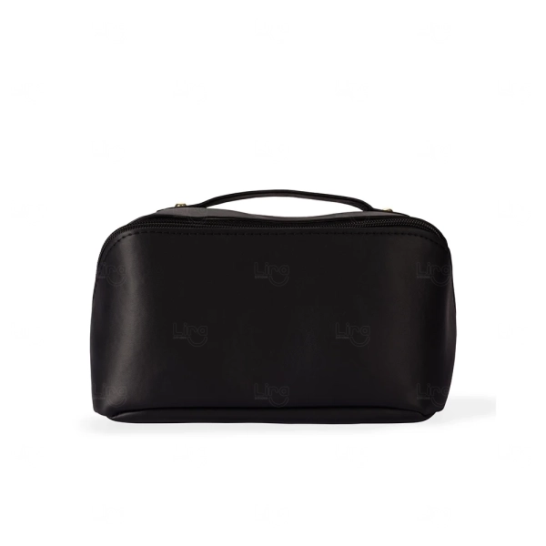 Nécessaire confeccionada em poliuretano (couro sintético), material resistente à água. Possui abertura de 180 graus, que facilita o acesso ao conteúdo. O design interno é funcional, com compartimento principal, dois bolsos laterais abertos e um bolso central com zíper. A alça de transporte reforça a praticidade do item, que pode ser personalizado com o logo da sua empresa para fortalecer a marca.