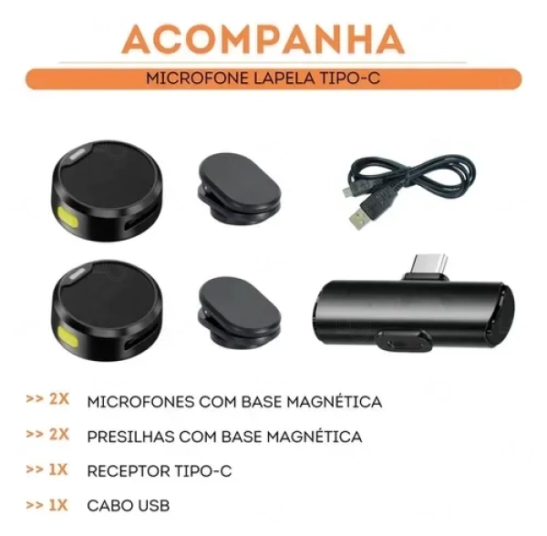 Este kit de microfone de lapela sem fio duplo oferece uma solução de áudio portátil para contextos corporativos. O conjunto inclui dois microfones transmissores com base magnética, duas presilhas dedicadas e um receptor compacto com conector Tipo-C, facilitando a ampla compatibilidade com dispositivos modernos.