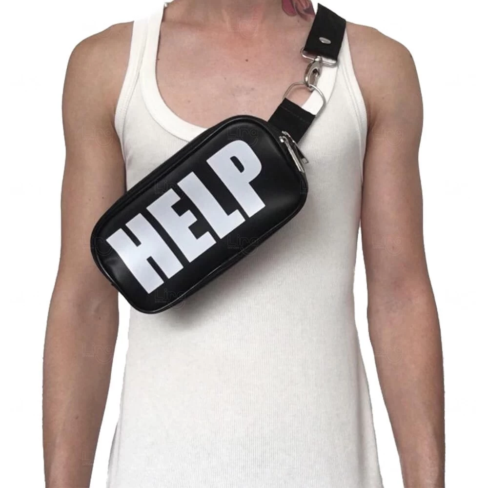 Pochete preta, com três compartimentos e alça ajustável com botões de pressão metálico e mosquetão. Acabamento interno com víes.